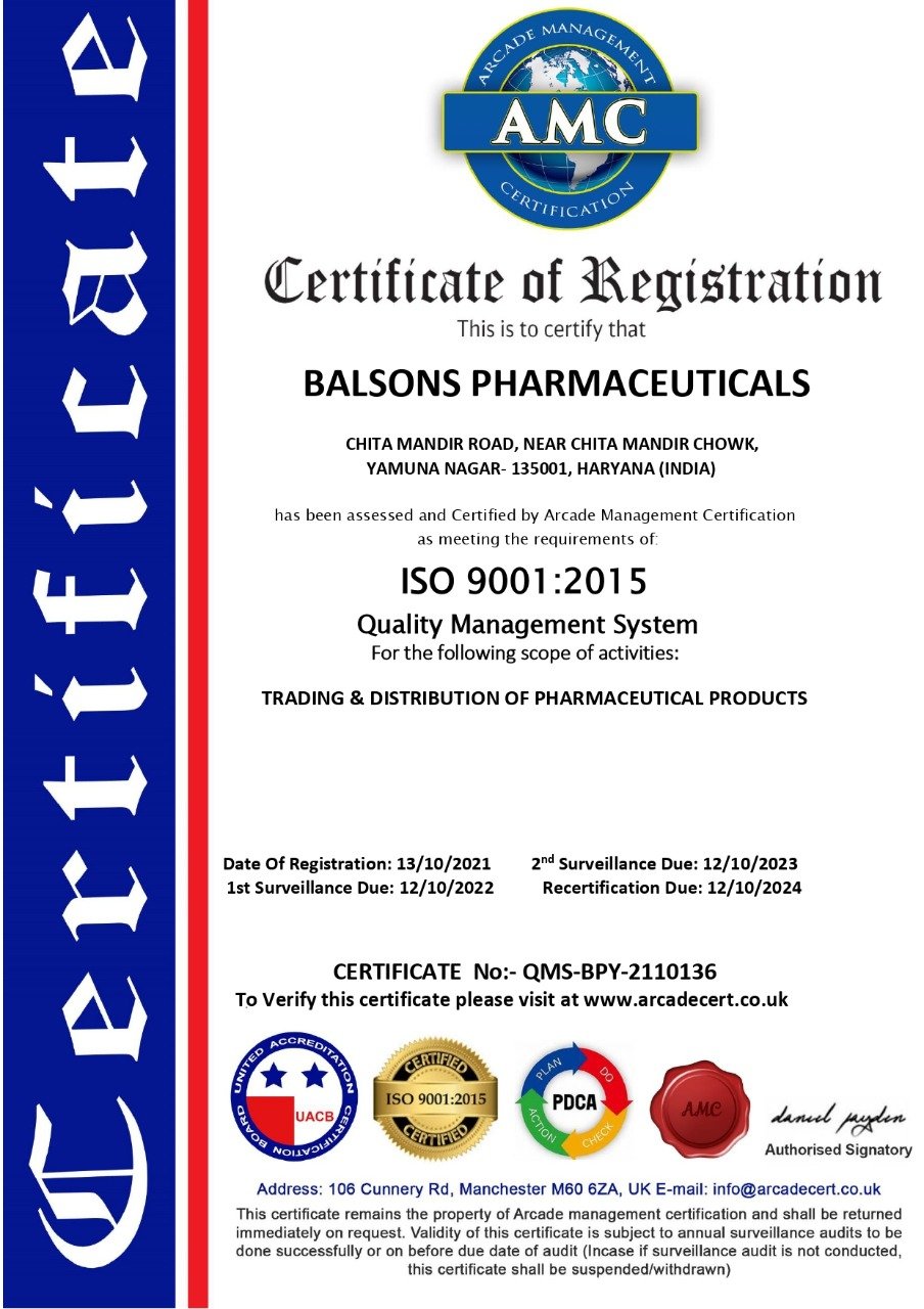 Balsons Pharmaceuticals was born of vision in 2010, headquartered at Yamunanagar in State of Haryana, INDIA. We are an ISO 9001:2015 certified organization lead by a team of dedicated professionals who are committed to deliver the best.